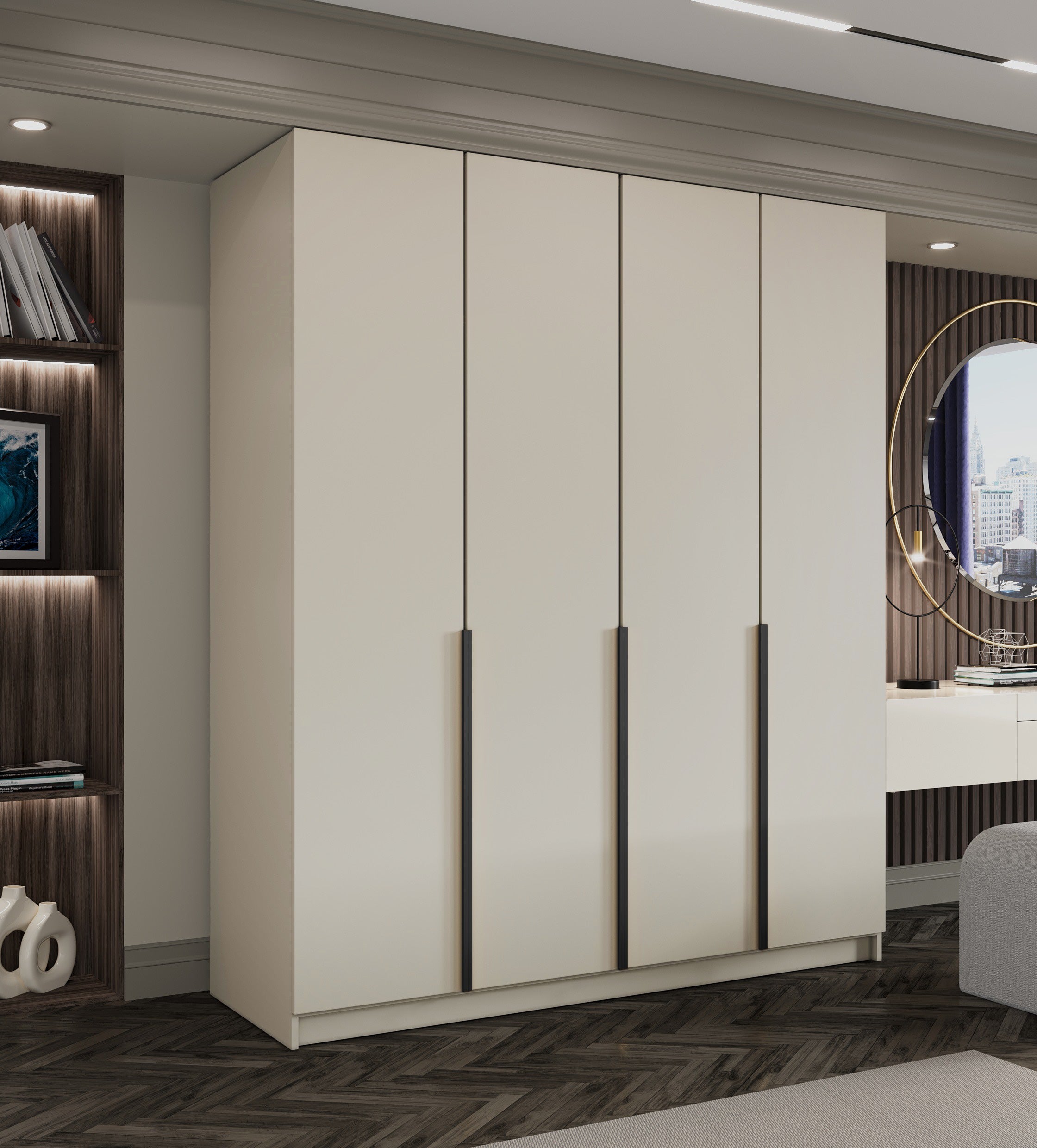Skrinka je vyhotovená v rafinovanej kašmírovej farbe a je k dispozícii so zlatými alebo čiernymi úchytkami – decentný detail, ktorý dokonale doplní váš interiér. Namiesto posuvných dverí má táto skrinka klasické pántové dvere, ktoré vytvárajú elegantný a nadčasový vzhľad.